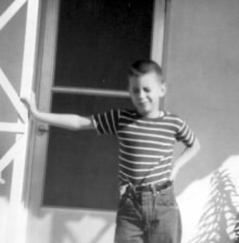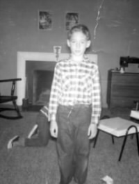 Our next door neighbor Doug Rice in our living room in White Plains. He was exactly two days older than me. You can see my brother's feet. |