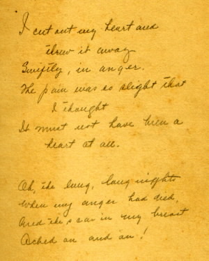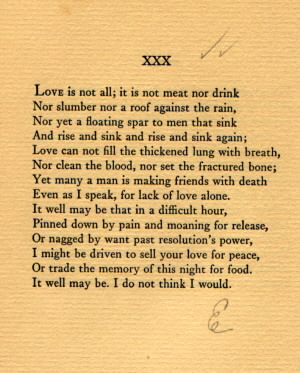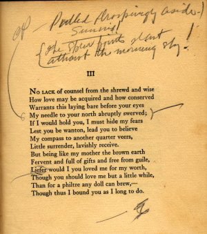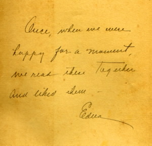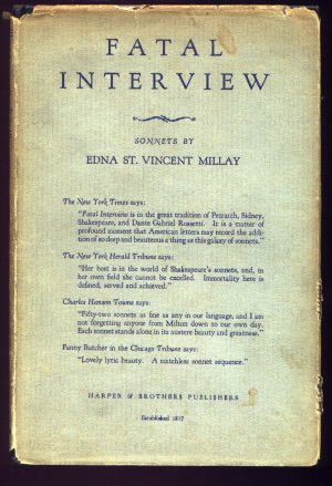 Edna St. Vincent Millay InscriptionsWe had two little books by Edna St. Vincent Millay that appear to be inscribed by her to a friend. "Second April" has an unsigned poem on the flyleaf and no other pencil marks in it. This is the first printing of the Harper and Brothers edition. The actual first edition was published by another publisher. With the second book, "Fatal Interview", it appears that Miss Millay made some marks in it and then signed it with a sentiment and gave it to someone. Maybe we should have gotten the name of the person who had the garage sale. A Buyer Found Us!We have had these scans on the internet for two or three years, not actively looking for a buyer but a buyer found us. He said he wanted them as a birthday present for his wife who is a big fan of Ms. Millay's poetry. What a thoughtful gift! I'm sure she will enjoy having them. | |