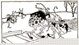 "Long ago," said the Potato Face Blind Man, "long before the necktie poppies began growing in the backyard, long before there was a necktie scarf like yours with the whiteface pony spots on a green frog swimming in the moonshine, back in the old days when they laid the rails for the railroad they laid the rails straight." "Then the zizzies came. The zizzy is a bug. He runs zigzag on zigzag legs, eats zigzag with zigzag teeth, and spits zigzag with a zigzag tongue. "Millions of zizzies came hizzing with little hizzers on their heads and under their legs. The jumped on the rails with their zigzag legs, and spit and twisted with their zigzag teeth and tongues till they twisted the whole railroad and all the rails and tracks into a zigzag railroad with zigzag rails for the trains, the passenger trains and the freight trains, all to run zigzag on. "Then the zizzies crept away into the fields |