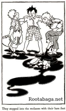 One fine summer morning all three mothers of all three boys gave each one a jug and said, "Go to the grocery and get a jug of molasses." All three got to the grocery at the same time. And all three went out of the door of the grocery together, each with a jug of molasses together and each with his secret ambition creeping around in his heart, all three together. Two blocks from the grocery they stopped under a slippery elm tree. Eeta Peeca Pie was stretching his neck looking straight up into the slippery elm tree. He said it was always good for his freckles and it helped his wishes to stand under a slippery elm and look up. While he was looking up his left hand let go the jug handle of the jug of molasses. And the jug went ka-flump, ka-flumpety-flump down on the stone sidewalk, cracked to pieces and let the molasses go running out over the sidewalk. If you have never seen it, let me tell you molasses running out of a broken jug, over a stone |