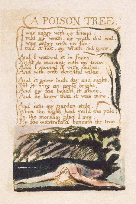 William Blake’s Poison Tree. I love the first stanza by itself. The other three are like poison icing on the poison cake.