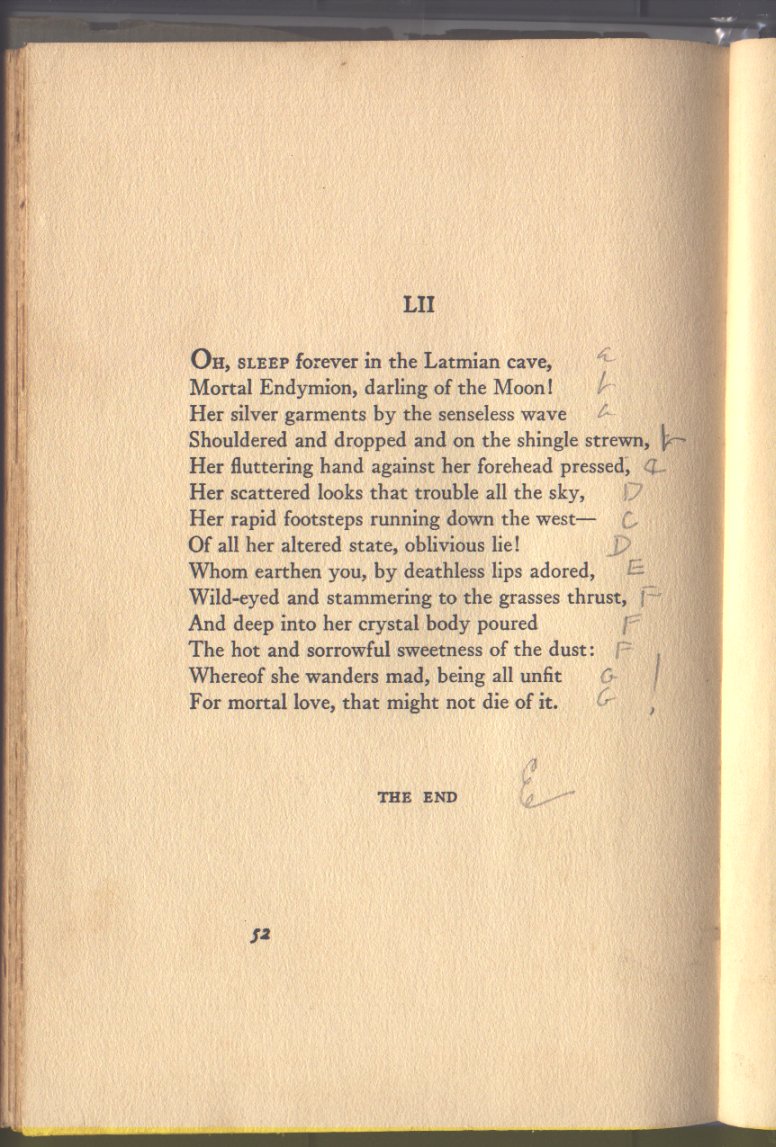 The following is the last poem in the book. Initialed "E" plus rhyme scheme noted.
