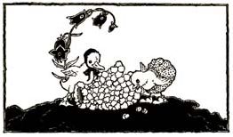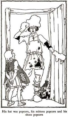 Squiff stepped into his house and home and said hello to his wife and daughters. They all began to laugh. Their laughter was a ticklish laughter. "Something funny is happening," he said. "And you are it," they all laughed at him again with ticklish laughter. Then they showed him. His hat was popcorn, his mittens popcorn and his shoes popcorn. He didn't know the gold buckskin whincher had a power and was working all the time. He didn't know the whincher in his vest pocket was saying, "You have a letter Q in your name and because you have the pleasure and happiness of having a Q in your name you must have a popcorn hat, popcorn mittens and popcorn shoes." The next morning he put on another hat, another pair of mittens and another pair of shoes. And the minute he put them on they changed to popcorn. So he tried on all his hats, mittens and shoes. |